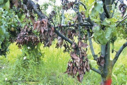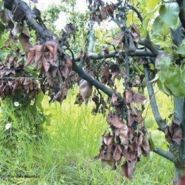 - Les jeunes pousses et rameaux contaminés flétrissent, prennent une couleur brun noir sur le poirier et s’enroulent en forme de crosse.