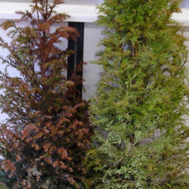 Sur Taxus sp., les symptômes débutent par un éclaircissement des aiguilles qui jaunissement et progressivement tournent au brun-rouge complet donnant à la plante l’aspect dépéri caractéristique d’un problème racinaire et/ou vasculaire (photo 1). Une analyse du système racinaire par nettoyage permet de constater le faible développement de celui-ci ainsi que l’absence de jeunes radicelles, témoins du manque de vigueur des plantes. Le collet et les racines sont envahis d’une pourriture associée généralement à une réduction de ce système radiculaire.
