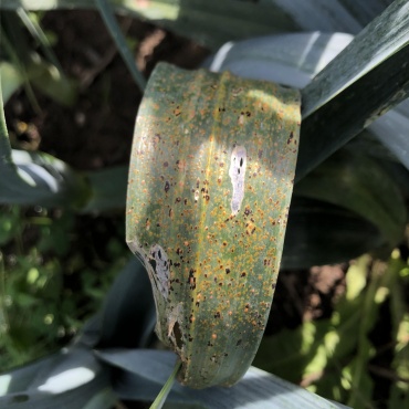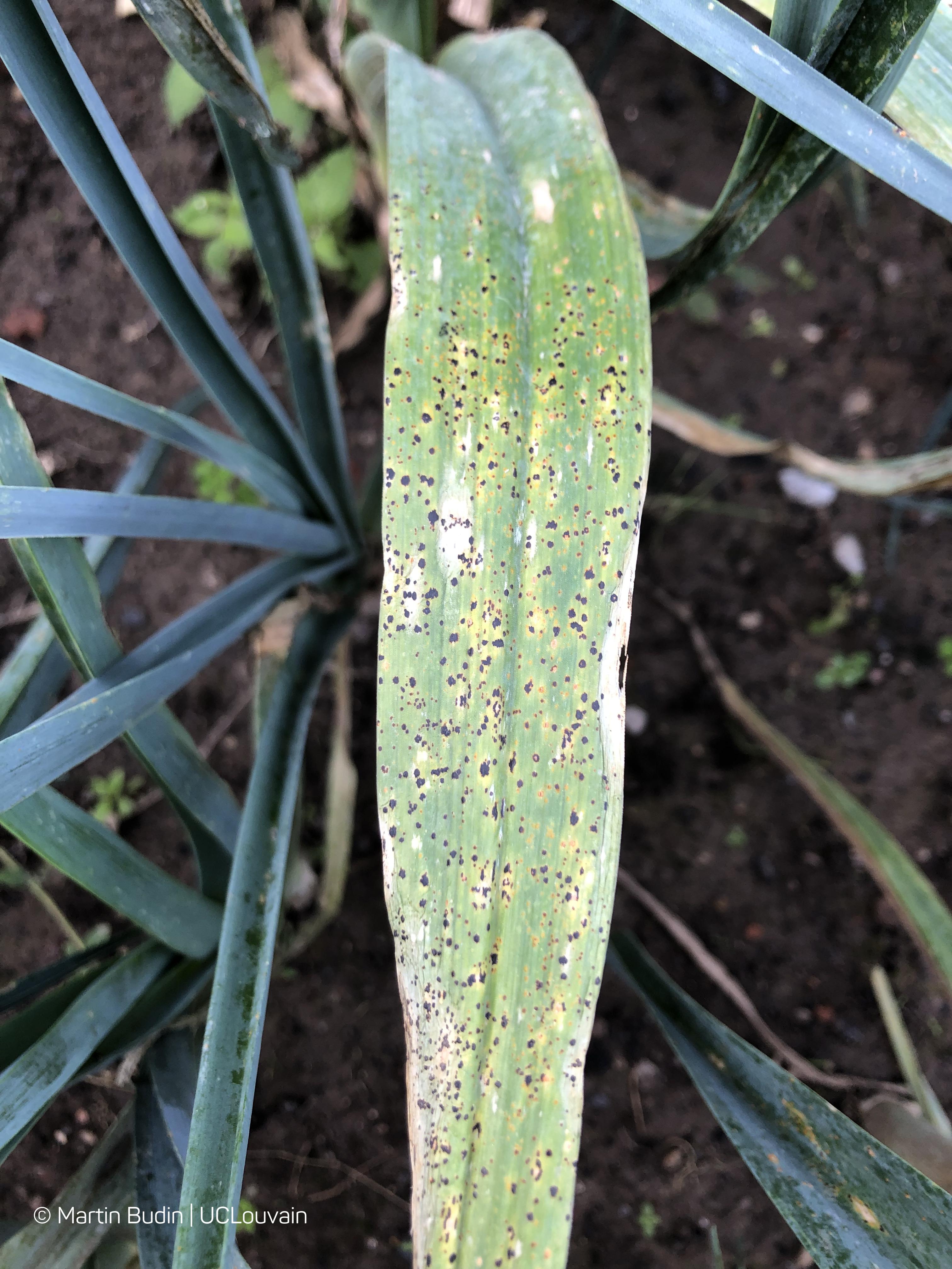 Cycle de vie : La rouille sur poireau peut être provoquée par deux champignons du genre Puccinia : Puccinia porri (rouille du poireau) et Puccinia allii (rouille de l’ail). La forme Puccinia allii est la plus fréquente. Les spores de rouille survivent dans les débris végétaux. Les adventices du genre Allium peuvent aussi faire office d’hôtes entre les saisons de culture. La rouille est un champignon parasite obligatoire et se doit donc d’hiverner dans les tissus végétaux. Le développement de la maladie n’est ralenti que lorsque l’hiver est froid. La contamination peut commencer dès le printemps mais c’est en automne que les dégâts peuvent être très problématiques. Les pustules de rouille évoluent jusqu’à éclater et libérer des nombreuses spores qui peuvent être dispersés par le vent car elles sont très volatiles.